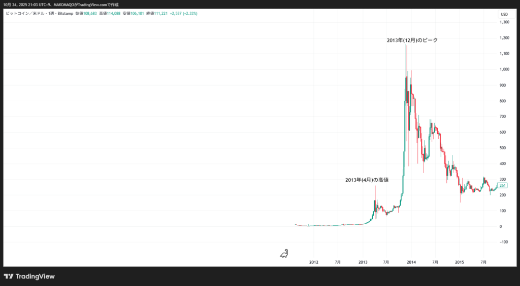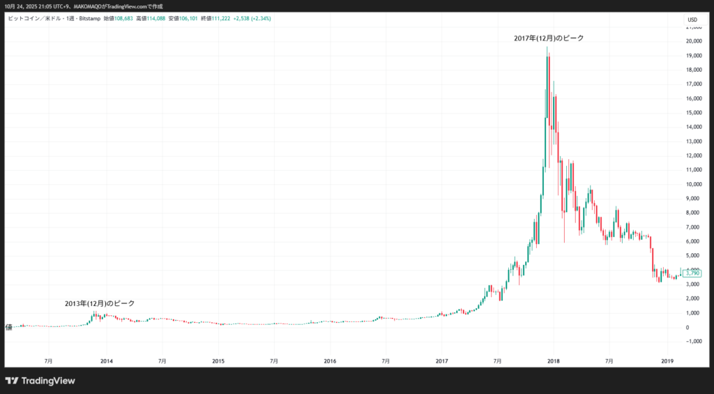 ビットコインが本当のピークを迎えるときは、現在のようなチャートパターンとは似ても似つかないものです。過去のピーク時のチャートを見てみましょう。