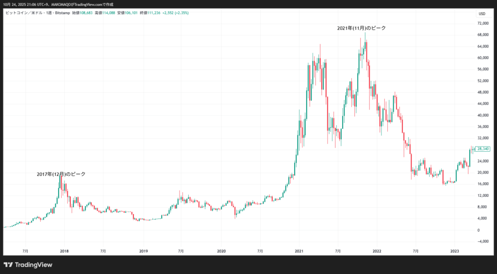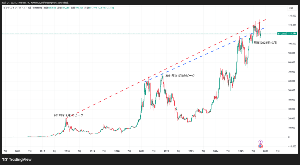 よくあるチャート分析では、①2017年と2021年のピークの延長線上(赤線)、②2021年のピーク時に形成されたダブルトップの延長線上(青線)が、2025年10月時点で11万ドル前後に達し、ここがビットコインの頂点になるという予測が広まっています。この分析に基づけば、その後は下落するというシナリオです。